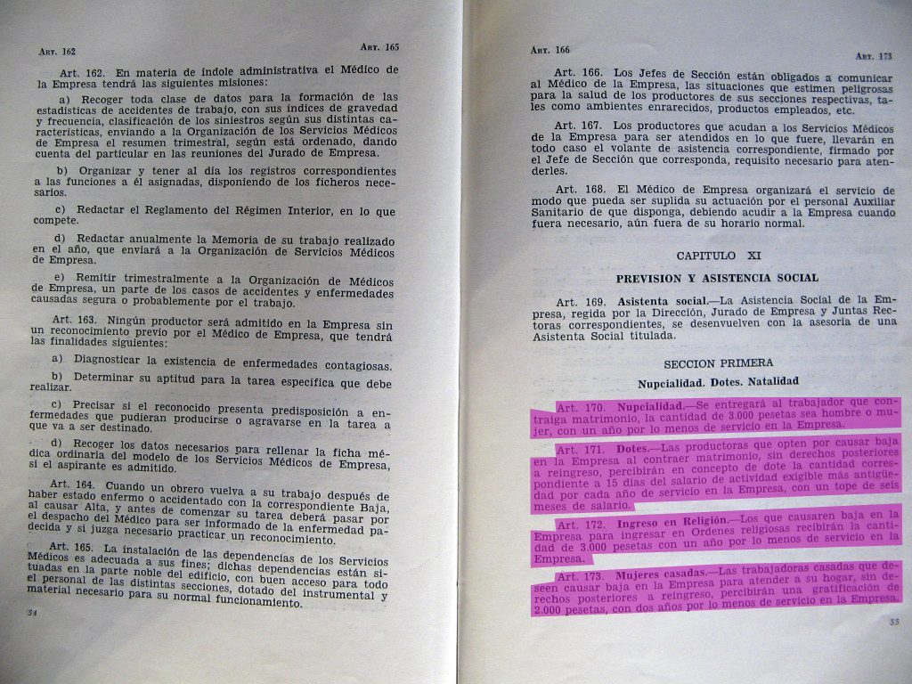 En el Capítulo de Previsión y Asistencia Social del Convenio Colectivo desde el año 1963 a 1967, existían varias cláusulas, que si bien no suponían una conciliación entre familia y trabajo, sí compensaban a las mujeres y hombres por el hecho de contraer matrimonio, tener un hijo o abandonar el trabajo para trabajar en el hogar. Por supuesto, en ese momento de nuestra historia, no existía conciliación sino que se compensaba a las naiperas que decidían dejar su puesto de trabajo para realizar el trabajo doméstico y la crianza. Con la perspectiva actual, dichas gratificaciones no serían justas ni válidas por no promover la igualdad. Sin embargo, en ese momento suponía un avance respecto a la situación laboral que las mujeres sufrían al contraer matrimonio o quedar embarazadas.
