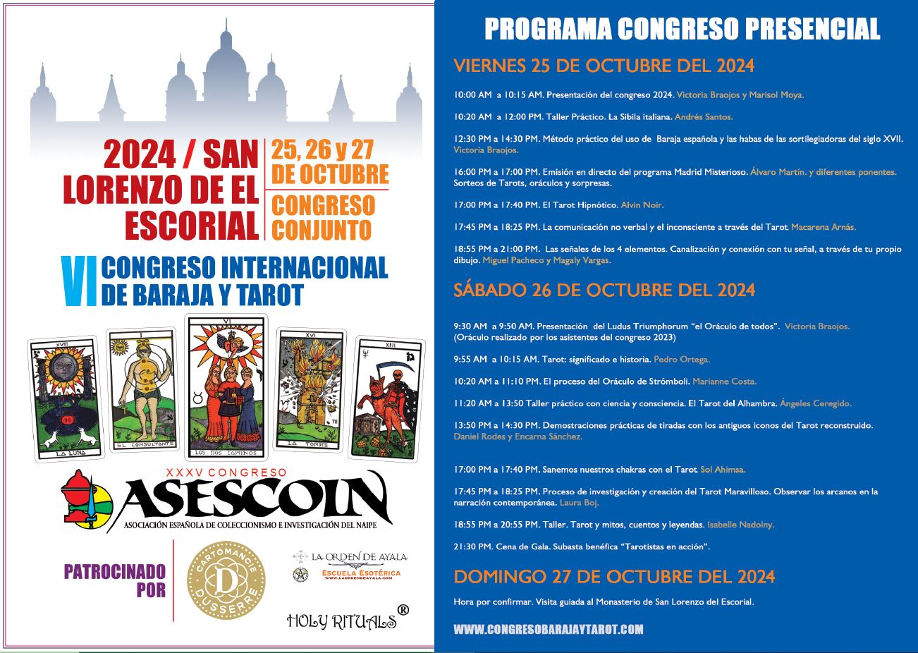 Esta nueva edición tendrá lugar en el emblemático San Lorenzo del Escorial de Madrid. Volveremos a ver a algunos de los mayores expertos del sector, quienes exploran la historia, la cultura y el arte asociados a estas prácticas. El congreso estará dirigido por Victoria Braojos, y contará con auténticos referentes tanto en el ámbito nacional e internacional. Los asistentes se reunirán estos días para disfrutar de un espacio donde compartir experiencias en torno al mundo del tarot y la cartomancia. Maestros, investigadores, doctores o coleccionistas.